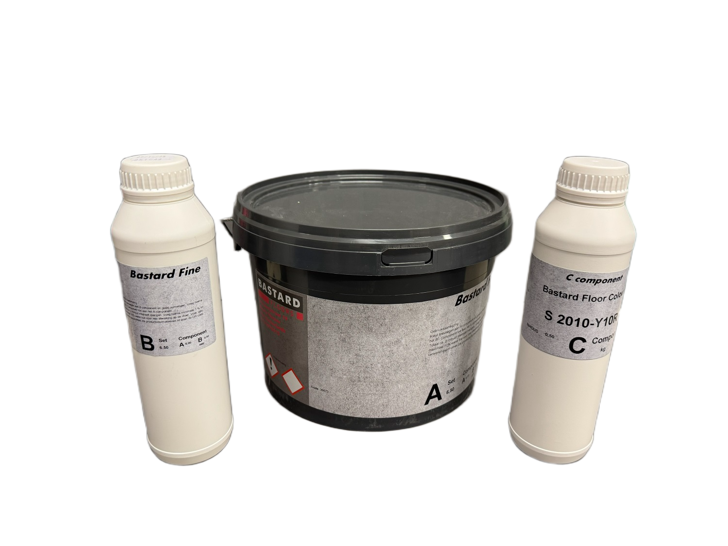 Je krijgt het Bastard systeem in 3 componenten aan. Je maakt de pot Bastard open en ga even met je platschopje of troffel langs de rand zodat de randen schoon zijn. Doe de colour bij de Bastard en meng deze met een garde op je boormachine totdat deze helemaal goed gekleurd is. Dat noemen ze homogeen. Nu kun je de verharder bij de gekleurde Bastard doen en meng dit even goed door. Haal weer even je platschopje of troffel langs de kanten en meng dat ook even goed door de rest heen zodat alles goed gemengd is. Je doet er nu nog wat water bij, tot een 10% kun je bijvoegen. Je kan het aangemaakte mengsel ongeveer 45 minuten verwerken.